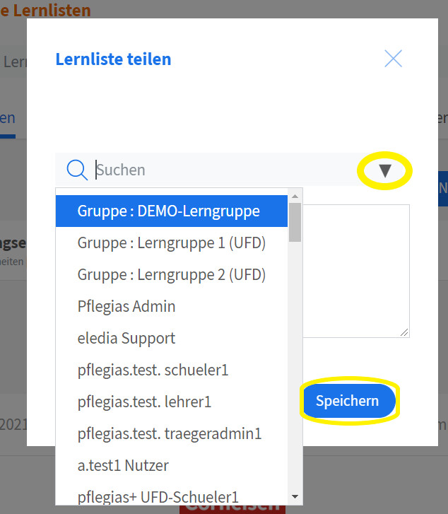 Wenn Sie im Bereich „Meine Lernlisten“ sind, sehen Sie eine Übersicht all Ihrer Lernlisten. Wählen Sie die aus, die Sie teilen möchten und klicken Sie auf das Share-Symbol (drei verbundene Punkte, direkt neben dem Symbol „Mülltonne“). Nun können Sie auswählen, ob Sie die Liste mit einzelnen Personen oder einer ganzen Gruppe teilen möchten. Geben Sie einfach die entsprechenden Namen in das Suchfeld ein und wählen Sie die richtigen aus.
