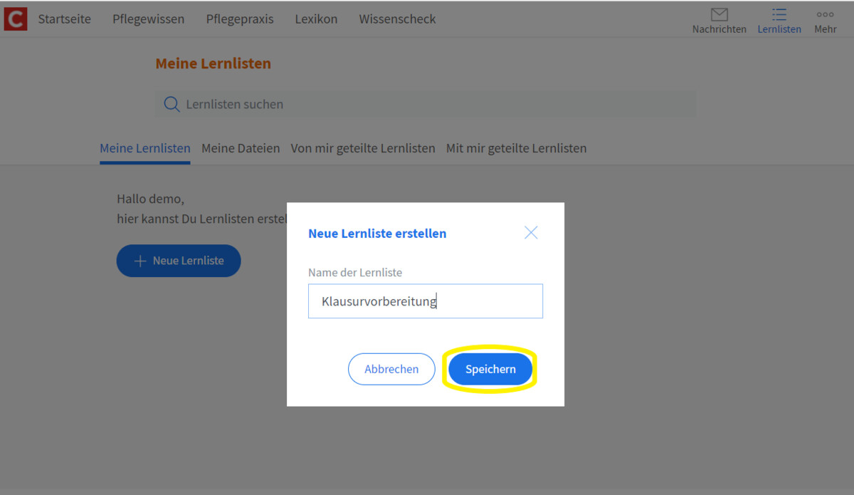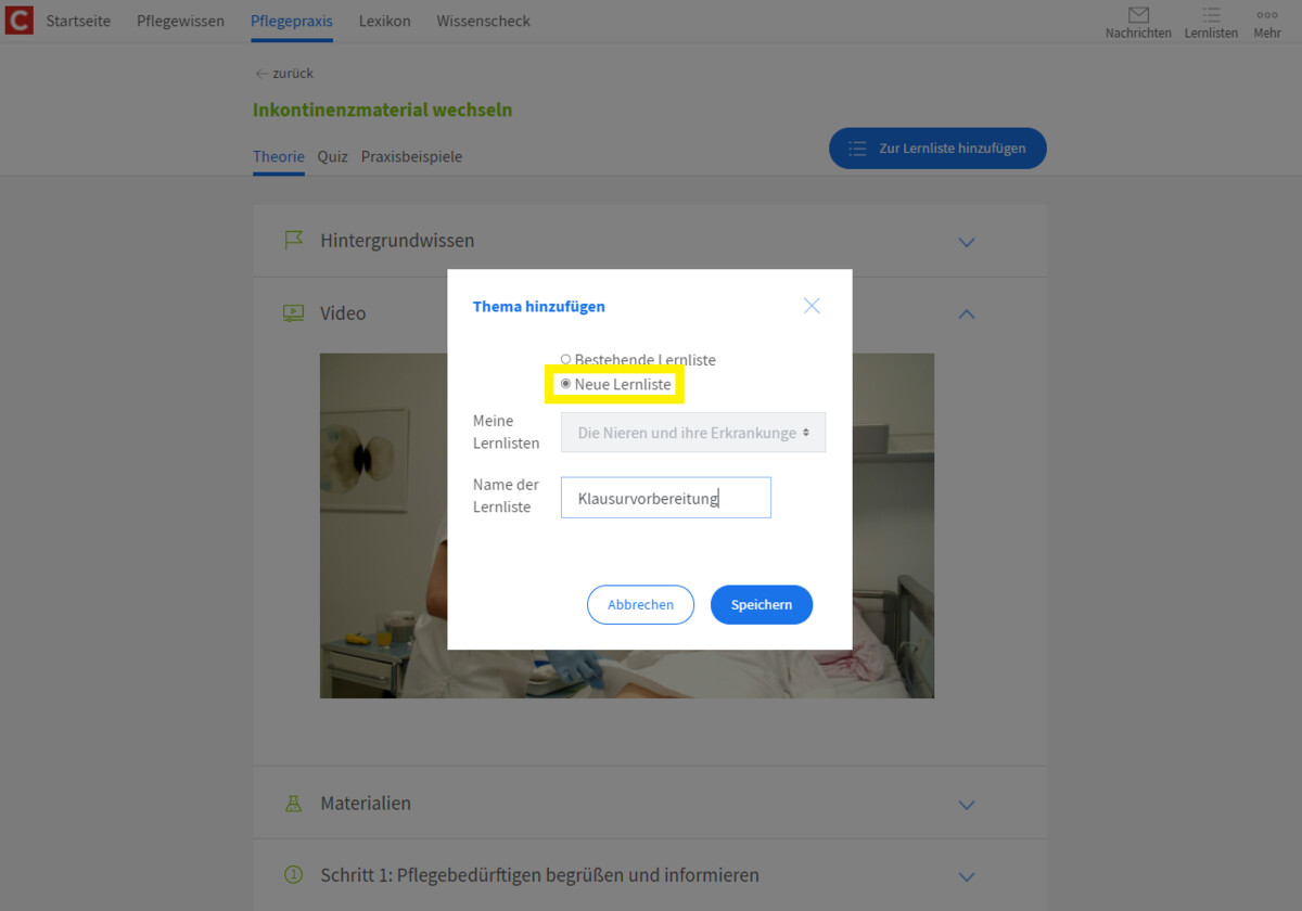 Alle Themen und Kapitel aus dem Pflegewissen, alle Einheiten der Pflegepraxis und auch die interaktiven Übungen können Lernlisten hinzufügt werden. Dazu klicken sie im oberen rechten Bereich des jeweiligen Elements den Button "zur Lernliste hinzufügen", wählen die entsprechende Lernliste aus und klicken auf "speichern".