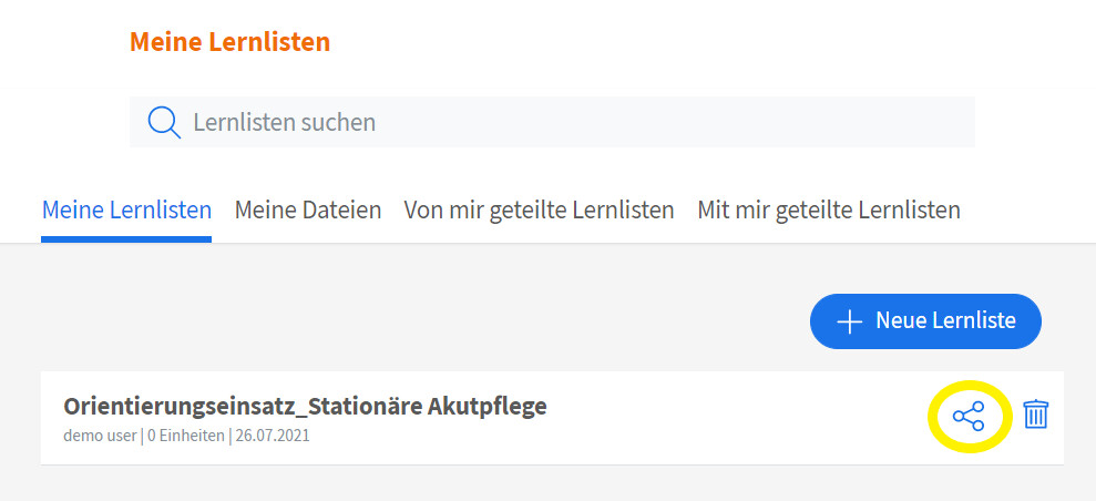 Im Header oben rechts auf der Startseite finden Sie einen Reiter „Lernlisten“. Wenn Sie diesen Reiter anklicken, gelangen Sie zum Bereich Ihrer Lernlisten. Lernlisten sind ähnlich wie Favoriten-Listen in Ihrem Browser. Sie können Listen mit verschiedenen thematischen Schwerpunkten erstellen, selbst benennen und ihnen anschließend Einheiten aus dem Pflegewissen, der Pflegepraxis und auch interaktive Übungen hinzufügen. Zusätzlich gibt es die Möglichkeit eigene Dateien hochzuladen oder externe Websites zu verlinken. Die erstellten Lernlisten können Sie anschließend mit Ihren Lernenden teilen und eine Notiz hinzufügen.